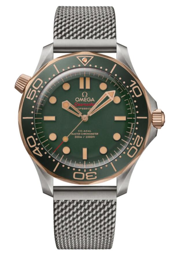 Omega launched another new UK top super clone Omega Seamaster Diver 300M watches today, this time with a two-tone case made of titanium and the brand’s proprietary Bronze Gold alloy. The dial is colored green and made of sandblasted aluminum with no waves, while the bezel insert is also green aluminum. The dial has no date, the bracelet is titanium mesh and the crystal is a bulbous domed sapphire.