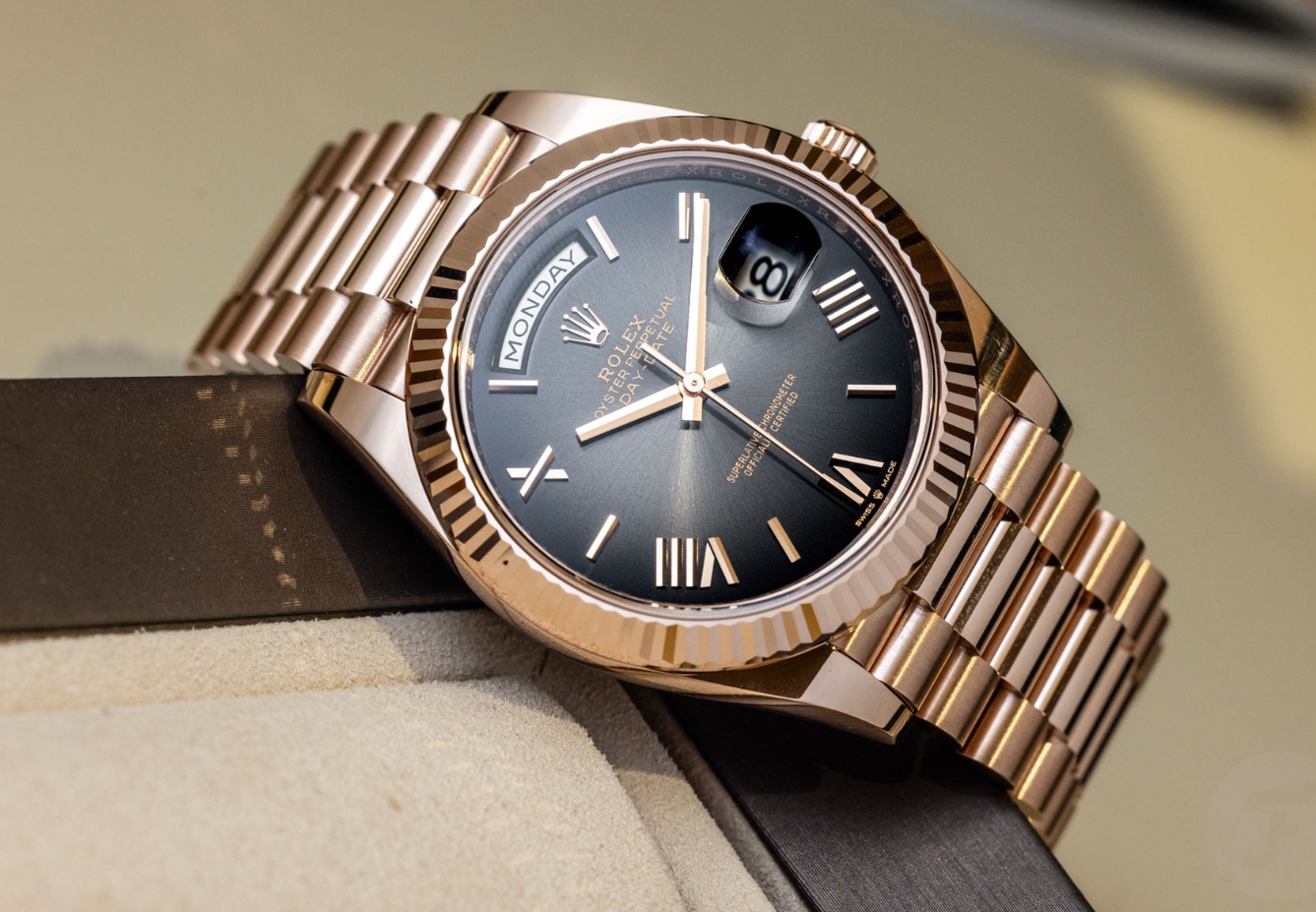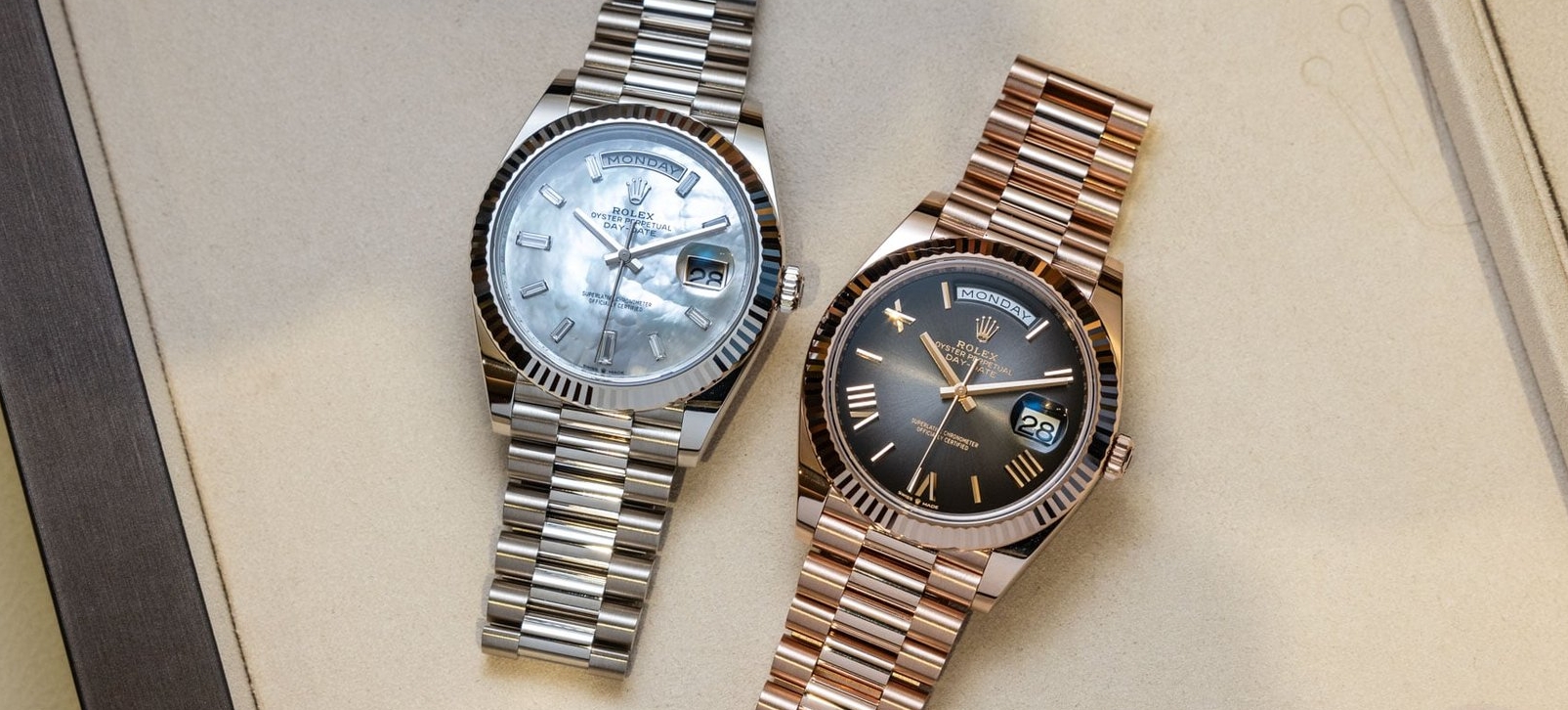 What do you think of the current Rolex Day-Date 40 refs. 228239 (white gold, €53,650) and 228235 (rose gold, €48,000)? Let us know in the comments section below!