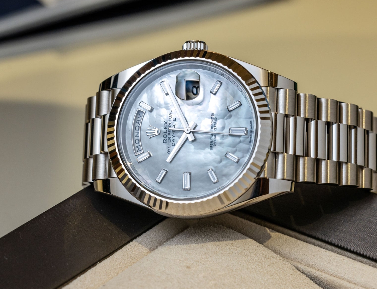 As I alluded to before, I feel the 40mm Day-Date represents a significant improvement over its 41mm predecessor. I can imagine you may not have spotted that these were the 40mm versions from the header picture alone. That’s a good thing! Here’s a little visual tell for the diamond-set model: the baguettes at 6 and 9 o’clock are slightly larger than the rest. On the 36mm version, all 10 diamonds are of equal size and shape.